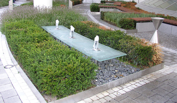 Außenbereich mit Sitzplätzen am Springbrunnen